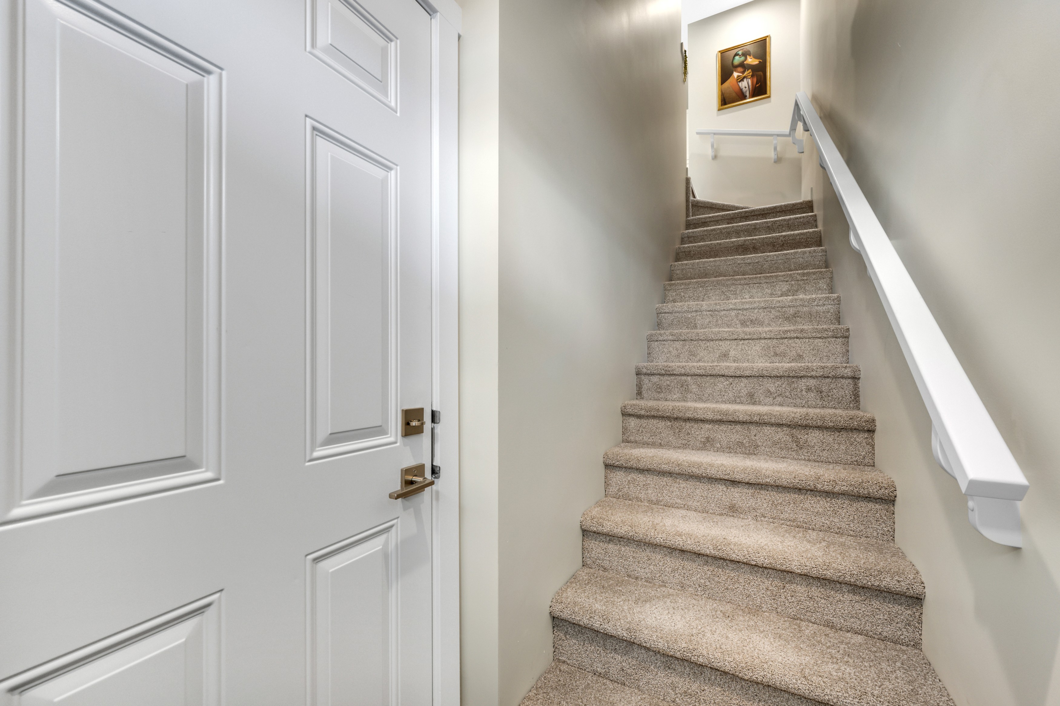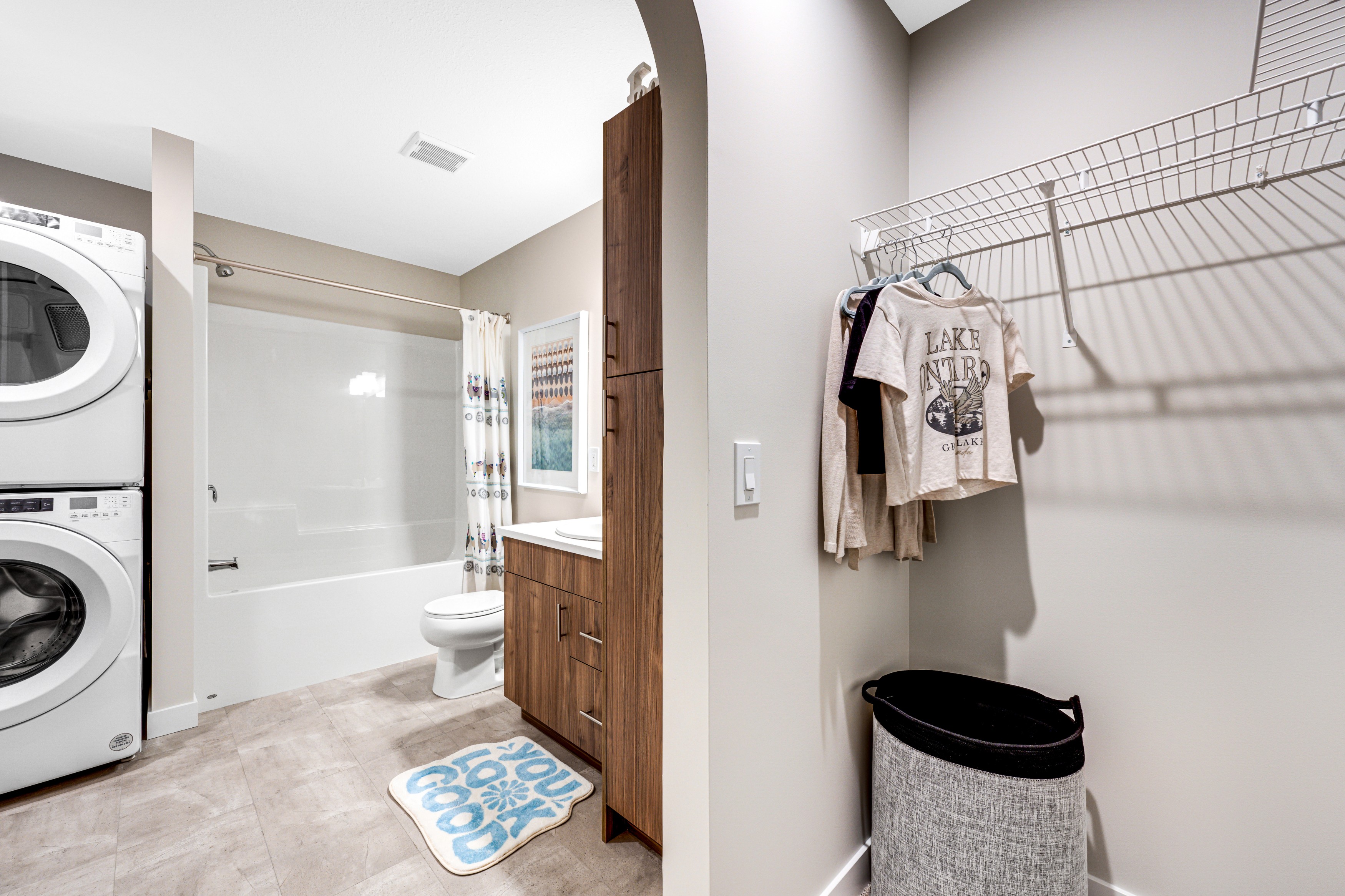 - Upper-floor laundry with ample storage